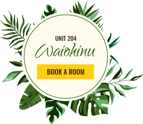 “Waiohinu” (Unit 204) is an upper floor 1-bedroom, ocean view condominium located in Hana Kai Maui’s Mauka (upper) building and accommodates 1-4 guests with 1 king bed and a queen hide-a-bed. There is a pass-thru window from the kitchen to the lanai with a glass table and comfy chairs to enjoy the amazing views of the Bay. The living room has open beam ceilings, recessed lighting, attractive furnishings, sliding wood doors and hard wood floors throughout. The bedroom has a beautiful carved teak headboard and dressers. Did you know that we offer one-night stays for this unit? Makes for a nice “taste” of Hana.